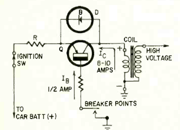 Este circuito de conmutación para automóviles platinados fue encontrado en una Radio Electrónica de abril de 1964. El circuito puede utilizar cualquier transistor de la época y las resistencias dependen de sus características. Los valores típicos de R están entre 2,2 y 10 ohms y para la resistencia base entre 47 ohms y 470 ohms.