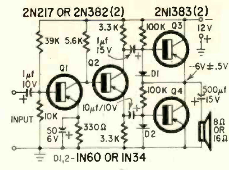 Este circuito de audio fue publicado en un número de Rado Electronics de octubre de 1963. Los transistores son de la época y la salida es de baja impedancia. La alimentación se suministra con una tensión de 12 V.