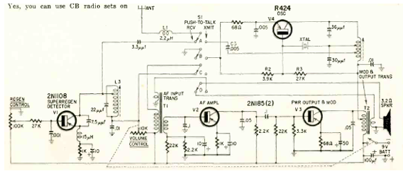 Se trata del CW-30 de Heathkit, un receptor miniaturizado de 4 transistores para banda ciudadana o 11 metros. El circuito apareció en la revista Radio Electronics en junio de 1961. La energía era suministrada por una batería de 9V.