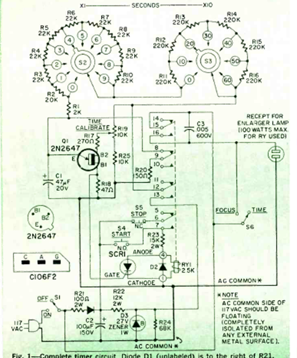 Este circuito se describió originalmente para aplicaciones en ampliadoras fotográficas. El circuito es de una revista de Radio Electronics de diciembre de 1969. Las redes de resistores se pueden sustituir por potenciómetros.