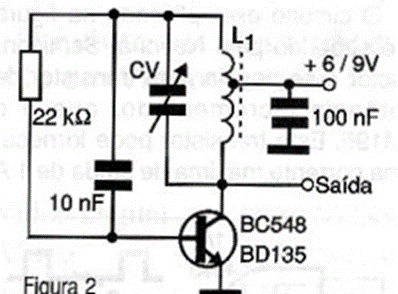 El oscilador Hartley modificado, visto en la figura 2, puede generar señales que van desde 3 MHz a 10 MHz, ajustadas en el condensador variable de 120 pF o más. Para el rango de frecuencia indicado, la bobina puede tener entre 20 y 30 vueltas de 28 hilos en una varilla de ferrita de 1 cm de diámetro con casquillo central. Con menos vueltas, el circuito puede oscilar a frecuencias de hasta 50 MHz. El capacitor de 10 nF debe ser cerámico, y la tensión de alimentación puede estar entre 6 y 9 V. También se pueden utilizar transistores equivalentes al BC548, y para una salida. De mayor potencia con fuente de alimentación de 12 V, se puede utilizar el BD135.