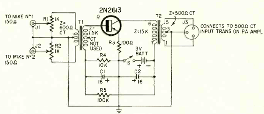 Este circuito lo encontramos en una Radio Electrónica de febrero de 1966. El transistor es de la época y los transformadores también. El circuito funciona con pilas. Observe las impedancias.