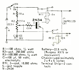 Este temporizador automático reciclable fue encontrado en la revista Radio Electronics de julio de 1960. El circuito activa un relé alcanzando intervalos de unos minutos dependiendo del capacitor utilizado.