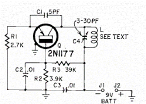 Este circuito de una Radio Electronics de marzo de 1964 utiliza un transistor de RF de la época. Se puede montar con el actual BF494 o equivalente. La bobina consta de 4 vueltas de alambre de 22 a 26 con un diámetro de 1 cm sin núcleo. Originalmente reproduce la señal en la televisión analógica mediante un proceso de intermodulación.