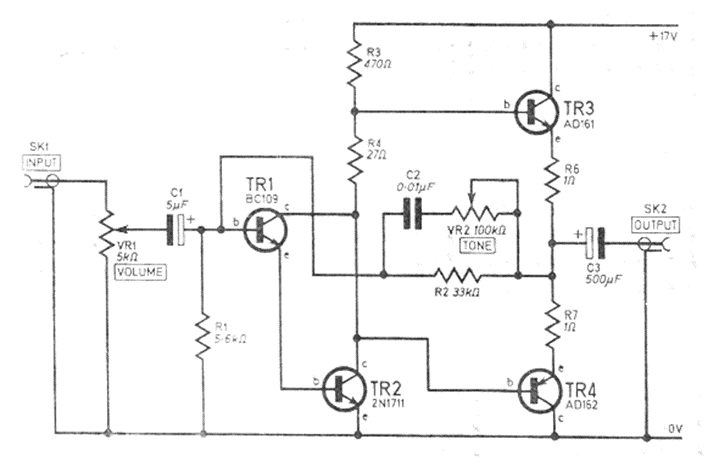El circuito que presentamos fue encontrado en una revista inglesa del año 1973. El par complementario de transistores de potencia AD161 y AD162 eran muy populares en aquella época, permitiendo construir buenos amplificadores de hasta 5 o 6 W. Si el lector encuentra estos transistores en chatarras, pueden usarlo en el circuito presentado, intercambiando TR1 por un BC548 y TR2 por un 2N2222 o BD135. La fuente es de 12 V a 15 V con al menos 1 A.