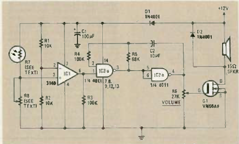 Utilizando el circuito integrado CA3140, este interruptor se encontró en la revista Radio Electronics de junio de 1986. El ajuste de sensibilidad se realiza en el trimpot en serie con el sensor.
