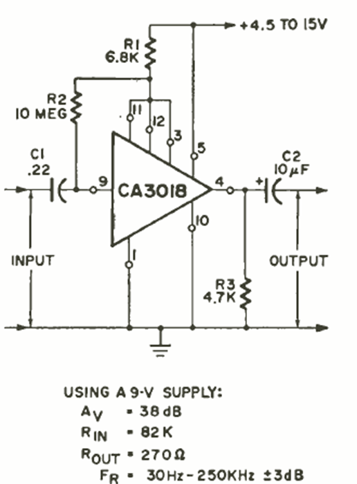Utilizando el circuito integrado CA3018 de RCA, este amplificador fue encontrado en un artículo de la revista Radio Electronics de agosto de 1970. Las características del circuito se dan al lado del diagrama.