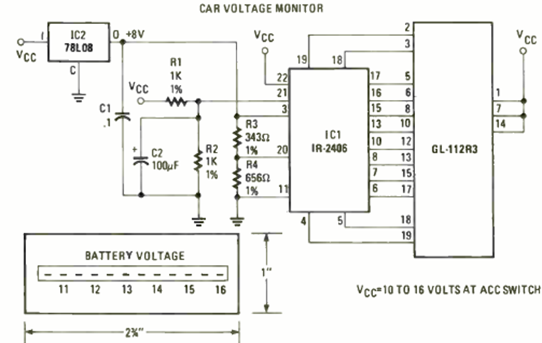 Basado en un circuito integrado de la época, este circuito apareció en la revista Radio Electronics en octubre de 1979. El circuito monitorea tensiones en el rango de 10,5 a 16,0 V.