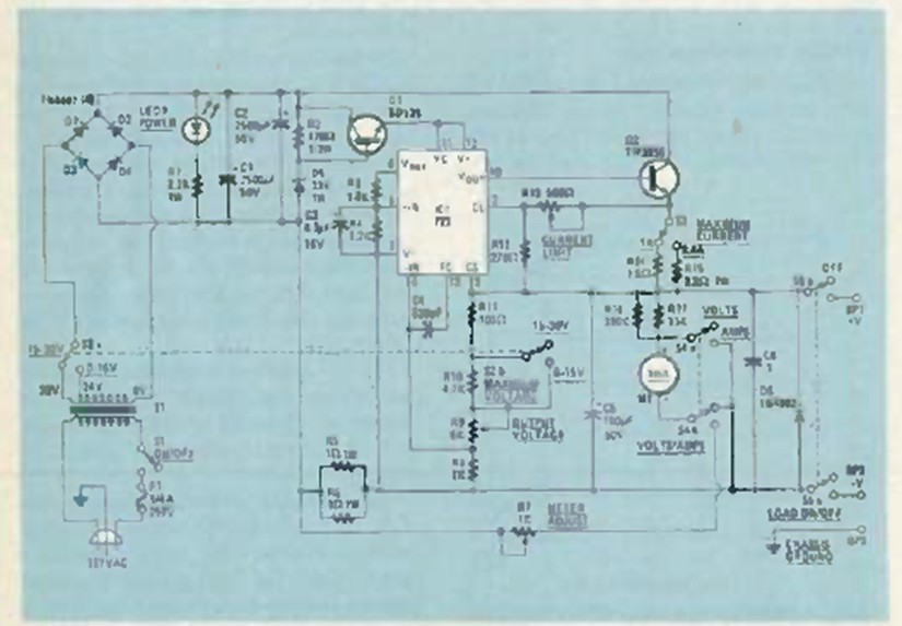 Esta fuente variable de 1 A con tensiones de hasta 30 V se encontró en un artículo de la revista Radio Electronics de junio de 1986. El CI 723 es muy conocido por los lectores de revistas de la época y aún hoy.