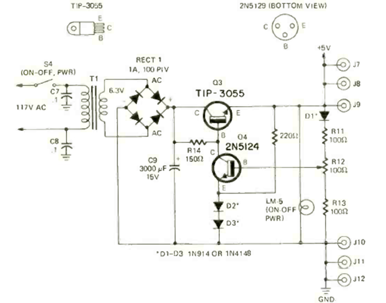 Encontramos este circuito fuente TTL en la revista Radio Electronics de diciembre de 1972. El circuito utiliza un transformador de 1 A y el transistor 2N3055 debe estar equipado con un buen disipador de calor.