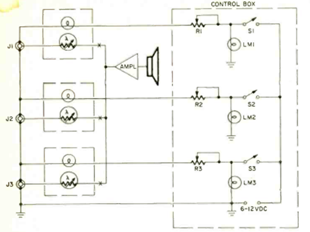 Es una idea interesante que encontramos en la revista Radio Electronics de mayo de 1971. Evidentemente se puede modificar utilizando LED en lugar de bombillas. El circuito controla la señal aplicada a las entradas de un amplificador en un tipo de mezclador.