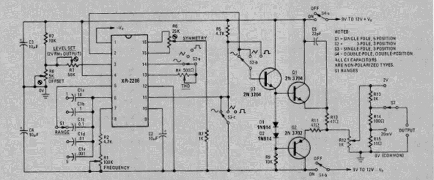Este bonito circuito generador de funciones con el XR2206 se encontró en la revista Radio Electronics de mayo de 1977. El circuito tiene una etapa de salida con transistores.