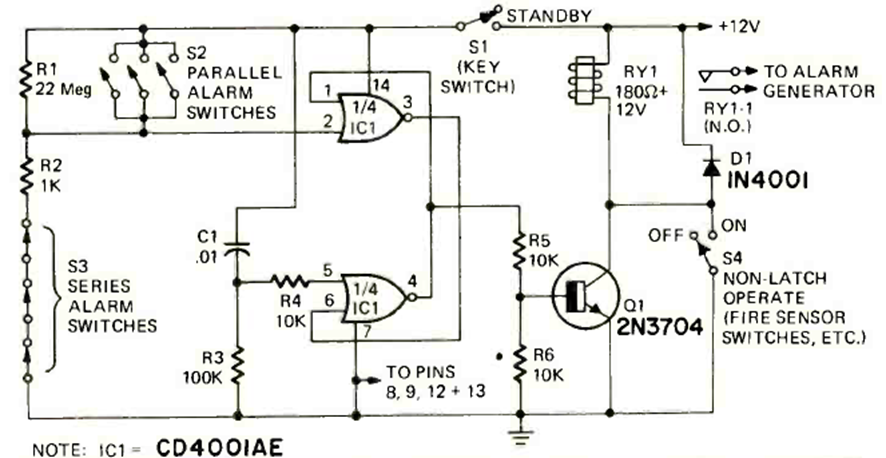 Encontramos este circuito en la revista Radio Electronics de abril de 1975. El circuito tiene bloqueo y funciona con sensores conectados en serie y en paralelo. La alimentación es de 12 V o dependiendo del relé utilizado.