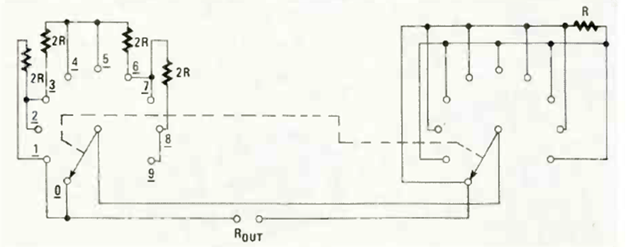 Hallado en una Radio Electrónica de enero de 1986, este circuito con dos interruptores permite obtener un gran número de valores de resistencia. Los valores de referencia se indican en el diagrama.