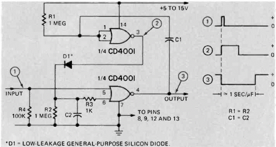 Este circuito se encontró en la revista Radio Electronics de noviembre de 1974. La tensión depende del suministro y la sincronización de R1 y R2, así como de C1 y C2.