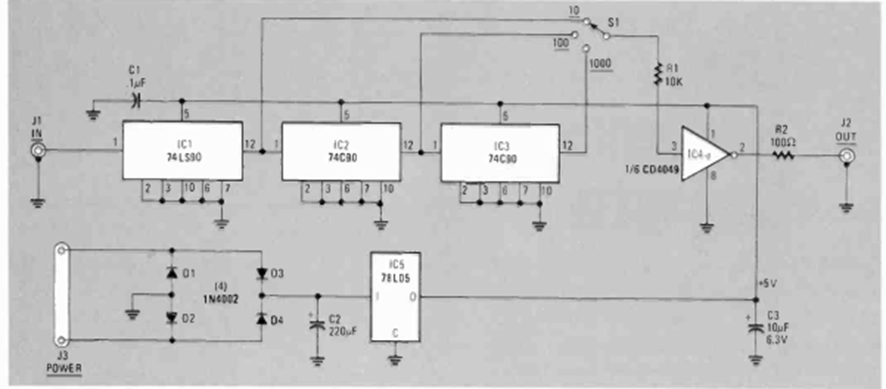 Este circuito TTL consta de un divisor o convertidor de frecuencia que tiene los valores seleccionados mediante un interruptor. El circuito es de una Radio Electrónica de diciembre de 1980 y debe alimentarse con una tensión de 5 V.