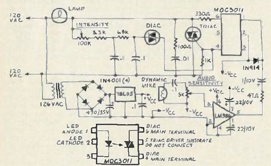 Este circuito para lámparas incandescentes fue encontrado en la revista Radio Elecronics de enero de 1980. La sensibilidad se puede controlar mediante un potenciómetro y el micrófono utilizado es del tipo dinámico.