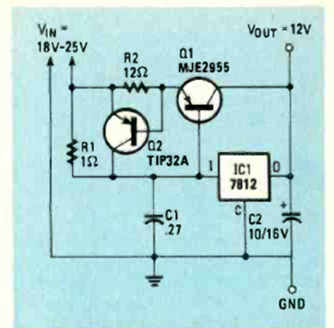 En la figura vemos cómo agregar un circuito de protección a un regulador 7812 con corriente aumentada. El circuito es de una Radio Electronics de julio de 1984.
