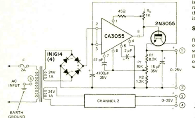 Este circuito fue encontrado en una revista de Radio Electrónica de noviembre de 1972. El circuito es basado en uno integrado de la época y la corriente es de 1 A y se ajusta en un potenciómetro.