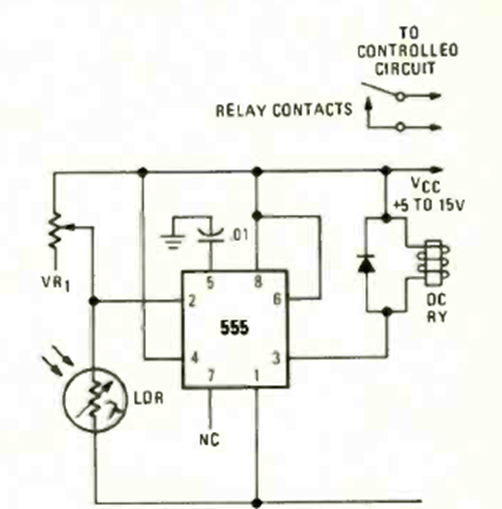 Este circuito se encontró en la revista Radio Electronics de septiembre de 1976. El circuito se activa mediante un haz de luz. El ajuste de sensibilidad se realiza en VR1.
