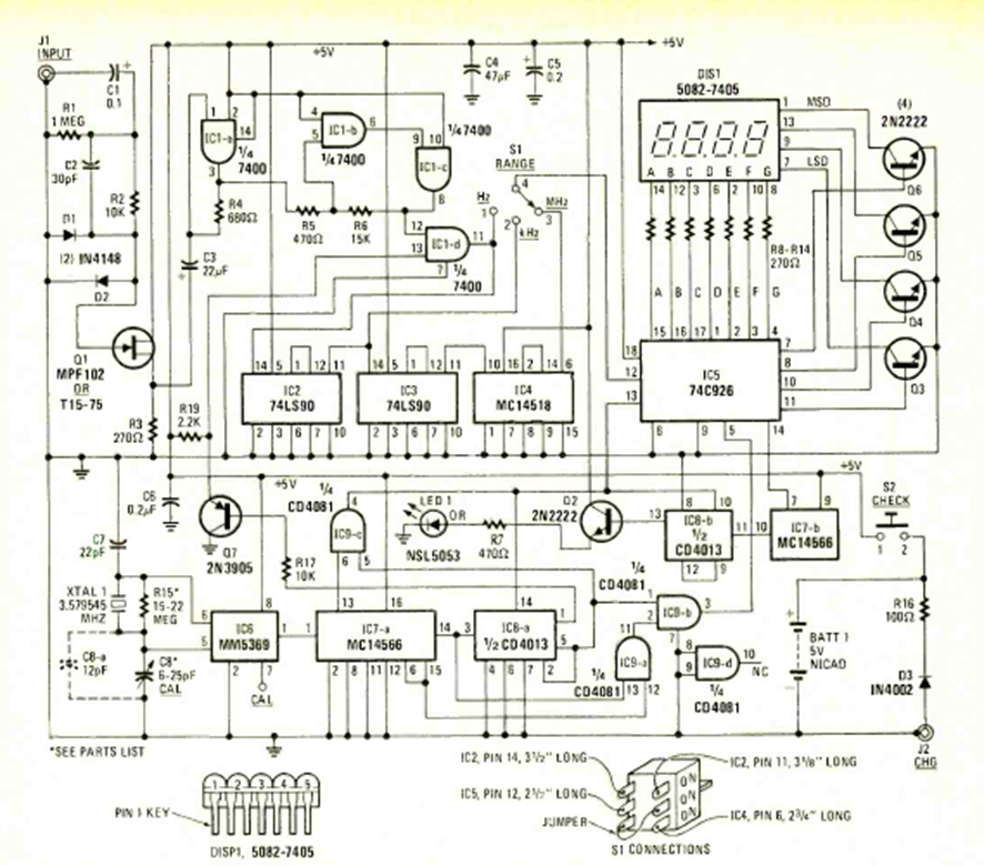 Este circuito es de Radio Electronics de marzo de 1978. El circuito de 4 dígitos utiliza un módulo de período y funciona con baterías. Los principales circuitos integrados son CMOS y TLL.