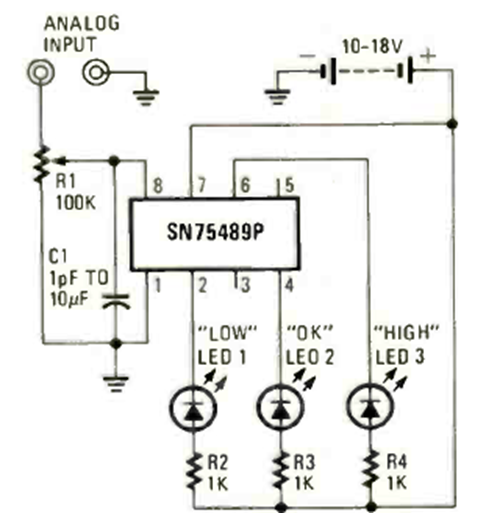Utilizando el SN75489P de Texas Instruments, este circuito se encontró en la revista Radio Electronics de junio de 1978. La alimentación se suministra con tensiones de 10 a 18 V.