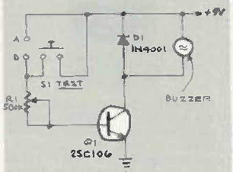 Este sencillo circuito activa una alarma (zumbador) cuando el sensor, formado por dos placas separadas por sustancias que absorben la humedad, recibe agua. El circuito es de una Radio Electronics de abril de 1986.