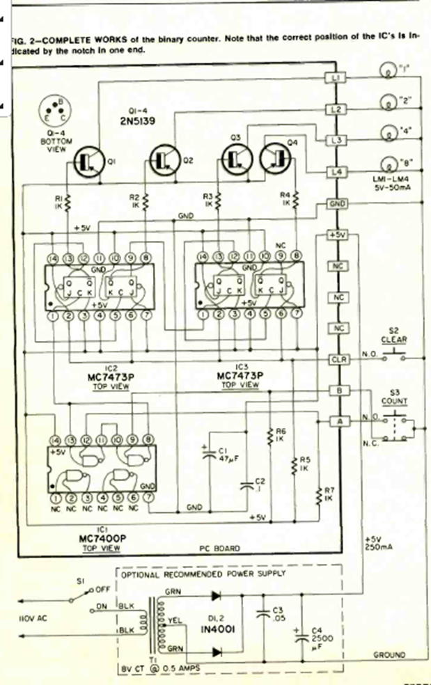 Este es el circuito completo de un contador binario con fines didácticos. Publicado en la revista Radio Electronics de febrero de 1973, emplea circuitos TTL digitales que todavía son bien conocidos en la actualidad. Se incluye alimentación de 5V.