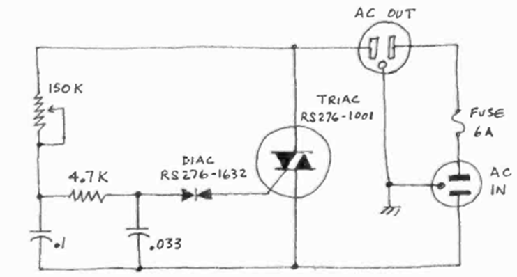 Esta configuración de atenuador común es una de las miles que han aparecido en publicaciones electrónicas de todo el mundo. Éste con triac fue encontrado en la revista Radio Electronics de octubre de 1977.