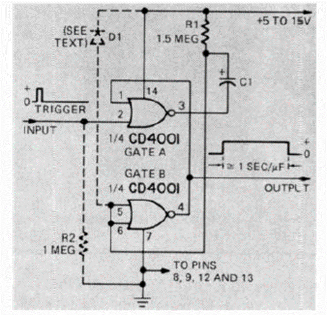 Este circuito es de la revista Radio Electronics, noviembre de 1974. El voltaje de suministro depende de la aplicación. El tiempo para mantener la salida en un nivel alto depende del condensador, normalmente 1 segundo para uF como se indica en el diagrama.