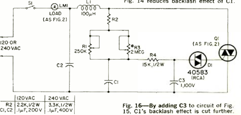 Esta versión del circuito anterior, también de la revista Radio Electronics de julio de 1970, utiliza R4 y C3 para un mejor rendimiento. El triac depende de la carga y debe estar equipado con un disipador de calor.