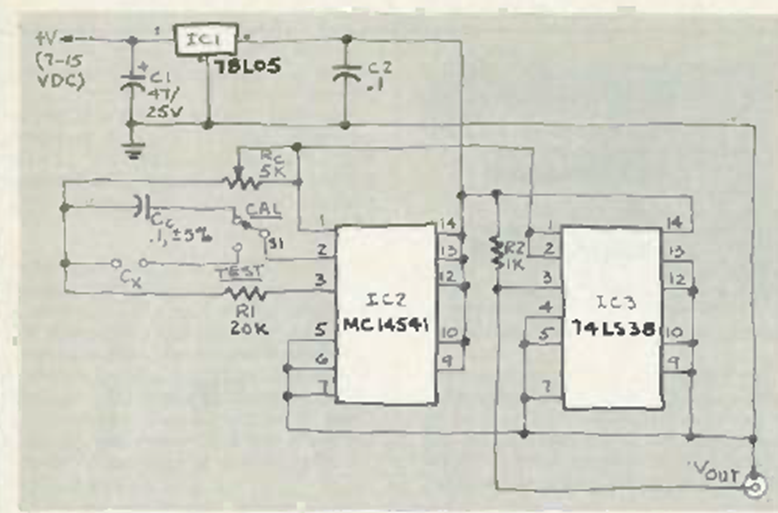 Este circuito de Radio Electronics de marzo de 1984 está destinado a permitir el uso del osciloscopio para medir capacitancias. El circuito utiliza integrados comunes.