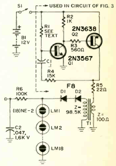 Este circuito genera un alto voltaje de alrededor de 250 a 300 V a partir de una batería de 12 V para alimentar una válvula Geiger. El circuito es de una revista Radio Electronics de enero de 1971.