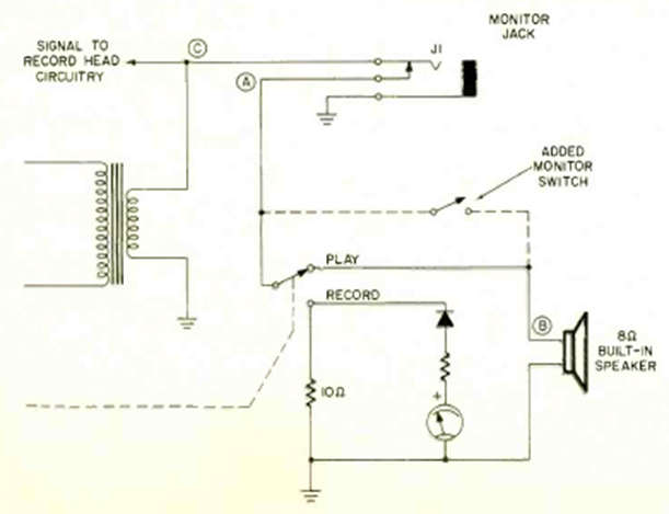 Con este circuito es posible monitorear una señal que se está grabando en una grabadora antigua. Puede que tenga otros usos en nuestros días. El circuito es de una revista Radio Electronics de noviembre de 1971.