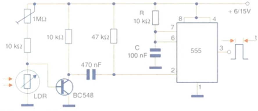 En la figura se muestra un primer circuito que utiliza un fototransistor como detector y es adecuado para cubrir distancias pequeñas (hasta 10 mm), y también se puede utilizar un interruptor óptico. Este circuito activa un relé, cuando el haz de luz Se corta la caída sobre el fototransistor. Para distancias muy cortas, la fuente de luz puede ser un diodo emisor de luz visible o infrarrojo. El relé dispone de una bobina de máximo 50 mA y tensión acorde a la utilizada para alimentar la etapa. Recordemos que este circuito produce un pulso únicamente durante el tiempo en que el objeto corta el haz de luz y que, por tanto, no tiene acción monoestable.