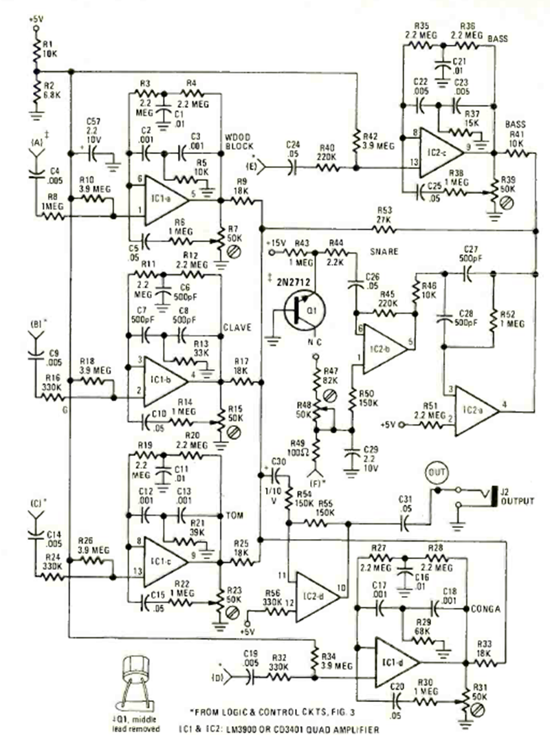 Este circuito de percusión se encontró en la revista Radio Electronics de febrero de 1978. El circuito utiliza un suministro de 3 tensiones y circuitos integrados de la época.