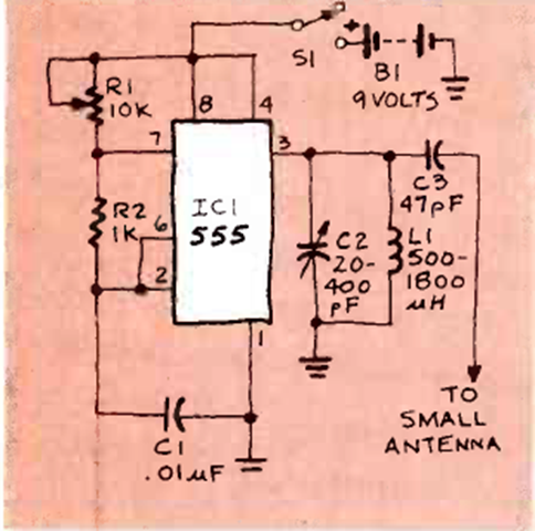 Este circuito experimental con el 555 envía señales en el rango de onda media a un receptor situado a pocos metros de distancia. El circuito es de una Radio Electronics de abril de 1982.