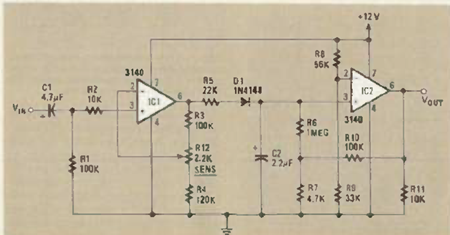 Este circuito se encontró en la revista Radio Electronics de junio de 1986. Se basa en dos CA3140 operativos y tiene una tensión de disparo ajustable.