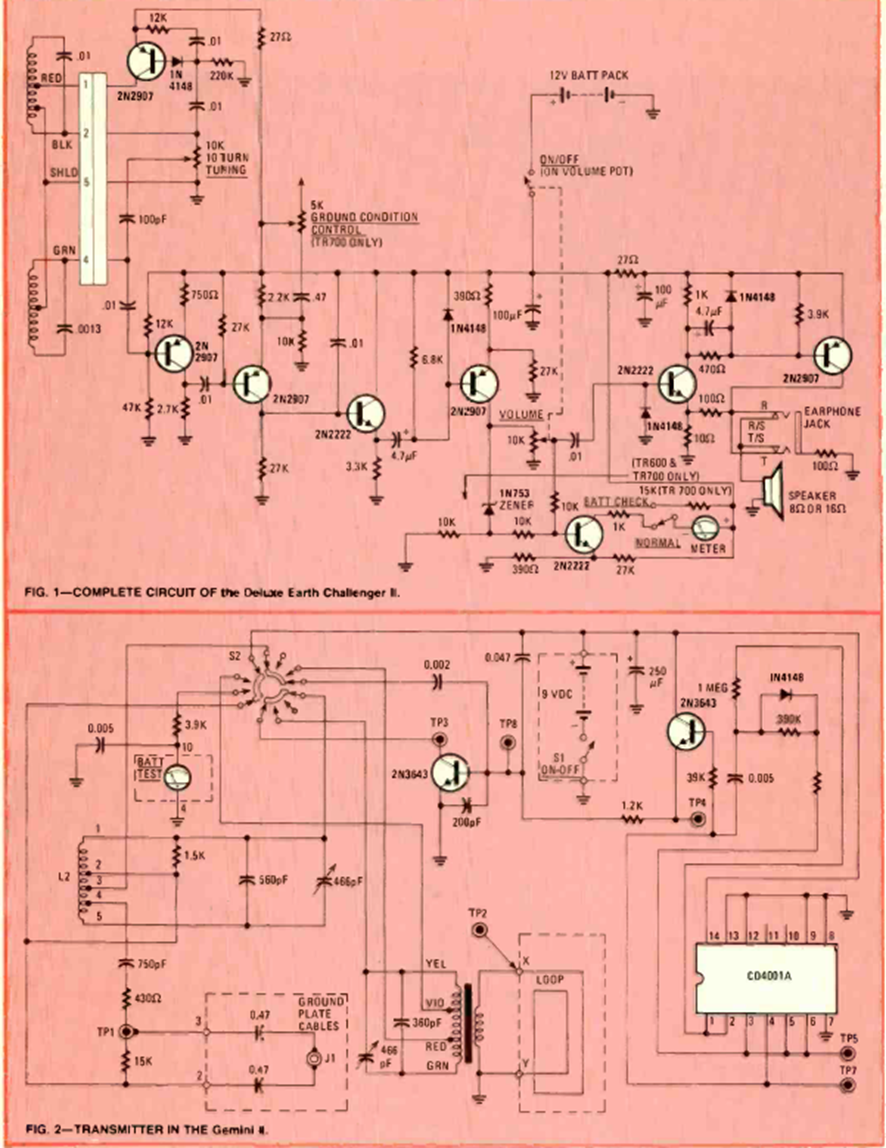 Este sofisticado detector de metales fue publicado en la revista Radio Electronics en noviembre de 1980. El artículo original daba detalles de las bobinas a operar y unos cientos de kilohercios. El receptor es el siguiente circuito.