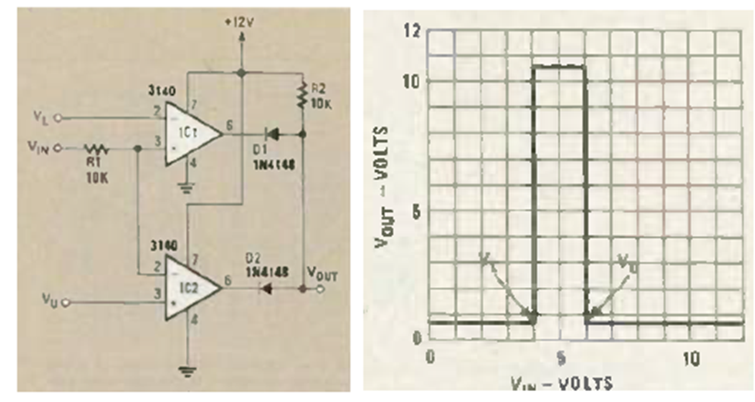 A diferencia del circuito anterior, esta salida alcanza un nivel alto en el rango de tensión de la ventana. El circuito es de Radio Electronics de junio de 1986 y está basado en el CA3140.