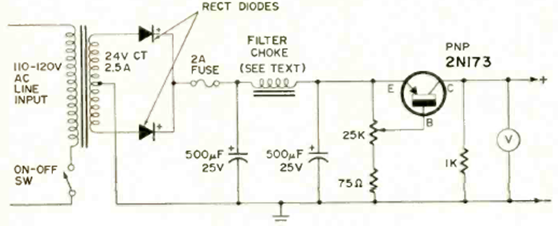 Esta fuente fue encontrada en la revista Radio Electronics de diciembre de 1970. El transistor podría ser el TIP42 montado sobre un disipador. El ajuste del voltaje de salida se realiza mediante el potenciómetro de 25 k.
