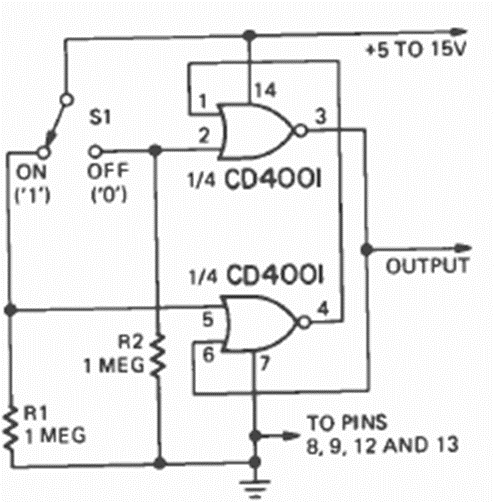 Esta clave sin repetir fue encontrada en la revista Radio Electronics de octubre de 1974. El circuito utiliza un interruptor 1 x 2 y debe ser alimentado por tensión según la aplicación.