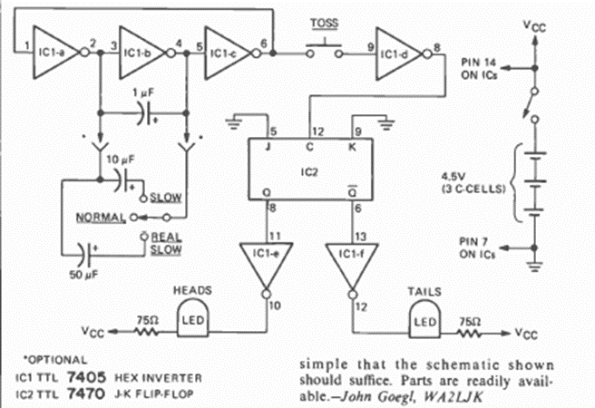 Este circuito de lanzamiento de moneda TTL se encontró en la revista Radio Electronics de julio de 1973. Los LED son tipos de la época. Observe la representación simbólica de este componente.