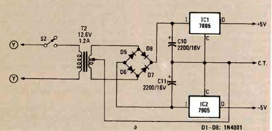 Este circuito para una corriente máxima de 1 A es la versión más común que utiliza los reguladores 78 y 7905. El circuito es de una revista de Radio Electronics de agosto de 1982. Los reguladores deben estar equipados con disipadores.
