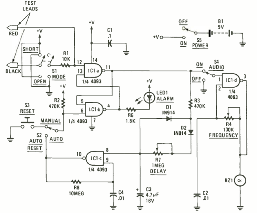 Este probador de continuidad con el 4093 se encontró en la revista Radio Electronics de noviembre de 1986. El circuito alimenta un zumbador cerámico con un ajuste de frecuencia.