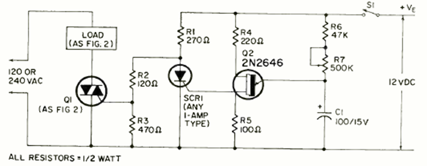 Este circuito triac enciende una carga después de un tiempo de 8 a 80 segundos ajustado por el potenciómetro R7. El circuito es de una Radio Electronics de junio de 1970.