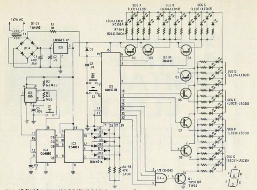 Al utilizar el LM3914, este reloj digital diferente utiliza un indicador de gráfico de barras LED. Los LED son los segmentos de una pantalla de 7 segmentos. Lo encontramos en la revista Radio Electronics de febrero de 1980.