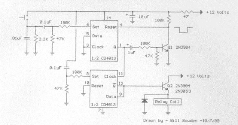 Este circuito fue encontrado en documentación de los años 90, utilizando componentes de la época. Los circuitos integrados son COMOS 4013 y la fuente de alimentación debe ser suministrada con el voltaje adecuado para la aplicación.