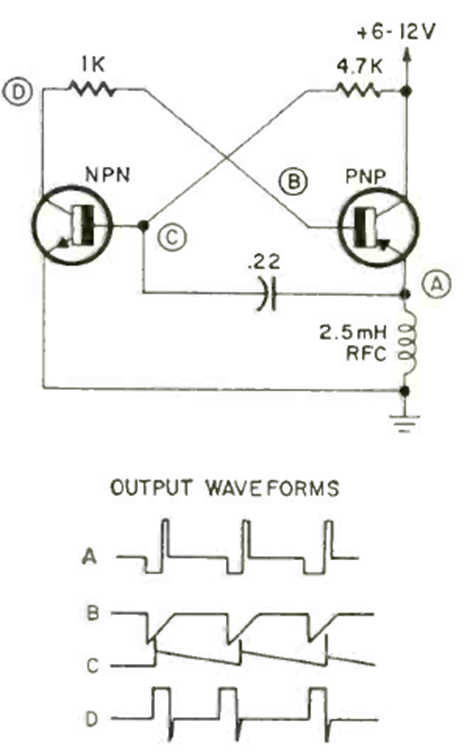 Este circuito fue encontrado en la revista Radio Electronics de septiembre de 1971. El condensador y el inductor determinan la frecuencia. Las formas de onda se dan al lado del diagrama. Para los componentes indicados, la frecuencia es de alrededor de 1 kHz.