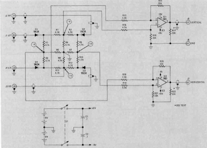 Este circuito multiplexor de señal para los primeros osciloscopios de baja frecuencia se encontró en la revista Radio Electronics de mayo de 1977. El circuito requiere una fuente simétrica.